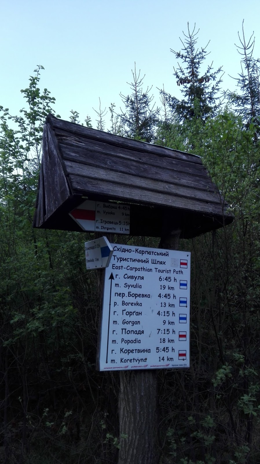 Po pasjonującej podroży w ciągu całego dnia pokonaliśmy z Lwowa ok 180 km, lądując o 19:30 w Bystricy. Na miejscu zakupiliśmy jeszcze po lodzie i ruszyliśmy w góry szukać miejsca na nocleg. Zdecydowałem, że nie będziemy pokonywać drogi wiodącej na przełęcz Legionów, którą schodziliśmy w 2014 roku ze względu na monotonię i brak miejsca obozowego. Postanowiłem, że wejdziemy szlakiem zielonym, prowadzącym bezpośrednio na grzbiet, a tam przetniemy linię dawnej granicy. Wieczorem przeszliśmy więc przez miejscowość i skierowaliśmy się na wschodnie stoki Gorganów. Planowaliśmy podejść do pierwszego miejsca oznaczonego na GPS znaczkiem biwaku. Niestety okazało się, że miejsce jest zupełnie nietrafione i położone głęboko w lesie. Pomimo zapadającego zmroku zdecydowaliśmy się podejść wyżej, do kolejnego biwaku. W zapadających ciemnościach szliśmy śladami ścieżki dydaktycznej, która musiała zostać sporządzona bardzo niedawno. Do kolejnego miejsca biwakowego na wys. ok. 1200 m npm dotarliśmy już po zmroku. Chociaż posiadało ono rozwiniętą infrastrukturę (ogrodzone, ławeczki, tablice, miejsce na ognisko, wiaty) to okazało się bardzo nietrafione. Źródełko, które zostało tam zlokalizowane było zaglonowane, więc musieliśmy obyć się z wodą, którą przynieśliśmy ze sobą. Ponadto wbrew pozorom, paradoksalnie trudno było znaleźć miejsce na namiot. Twórcy biwaku bowiem poprzestali na wyrównaniu terenu z grubsza buldożerami i wstawieniu kilku wiat. Generalnie porażka, z której chcąc - nie chcąc musieliśmy skorzystać.